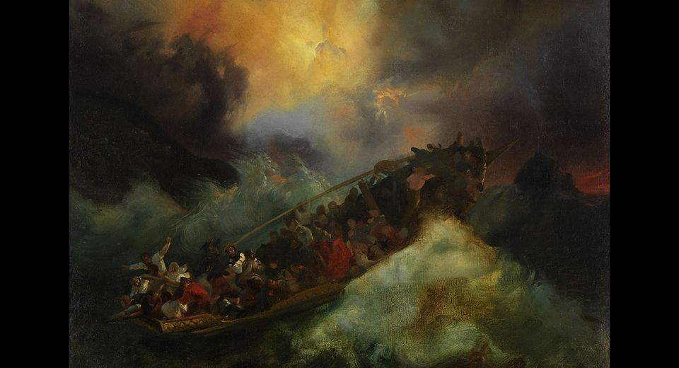 On 7 January 1831, the French fleet was caught in a major gale: at around 9 o’clock in the morning, troops were being transported to the sixty-gun frigate La Syrène aboard two small Mediterranean warships known as xebecs, when gale-force winds drove the vessels towards the coast. Gudin made a sketch of the event: One of the xebecs forms a central feature of this small-format work, whilst the other is scarcely sketched in. The faces of the sailors in the front of the boat are only depicted by a few touches of pure colour whereas those at the back are rendered in much greater detail, in the same postures as in the final painting. But the most remarkable thing about the work is the intensity with which Gudin depicted the raging sea and stormy skies, drawing on a complex palette of bright colours and making clever use of chiaroscuro. This preparatory painting preceded a large-format work that was presented at the Louvre’s Painting and Sculpture Salon in 1835 and contributed to his reputation.