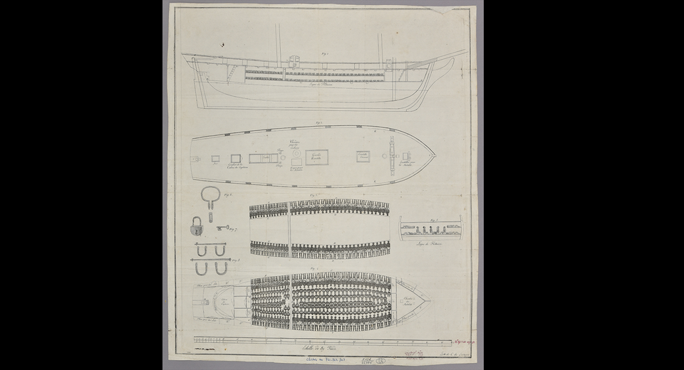 Publié en 1823, ce plan du brick La Vigilante donne à voir les aménagements intérieurs d’un bâtiment en configuration de négrier pour la traversée entre l’Afrique occidentale et les colonies américaines.