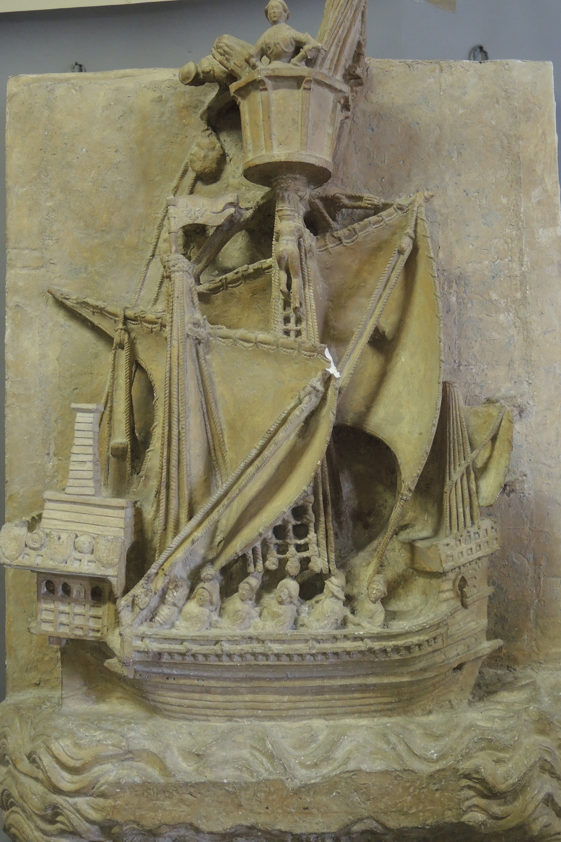 Agrandir l'image : Sculpture en relief montrant un grand bateau ancien avec un mât, des voiles et des décorations, entouré de motifs sculptés dans la pierre