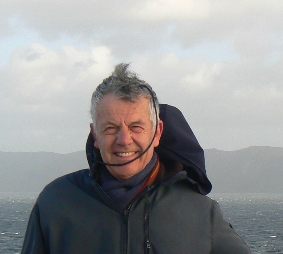 Agrandir l'image : Portrait d’un homme souriant sur un bateau, portant une veste sombre, avec une mer agitée et une île montagneuse en arrière-plan.