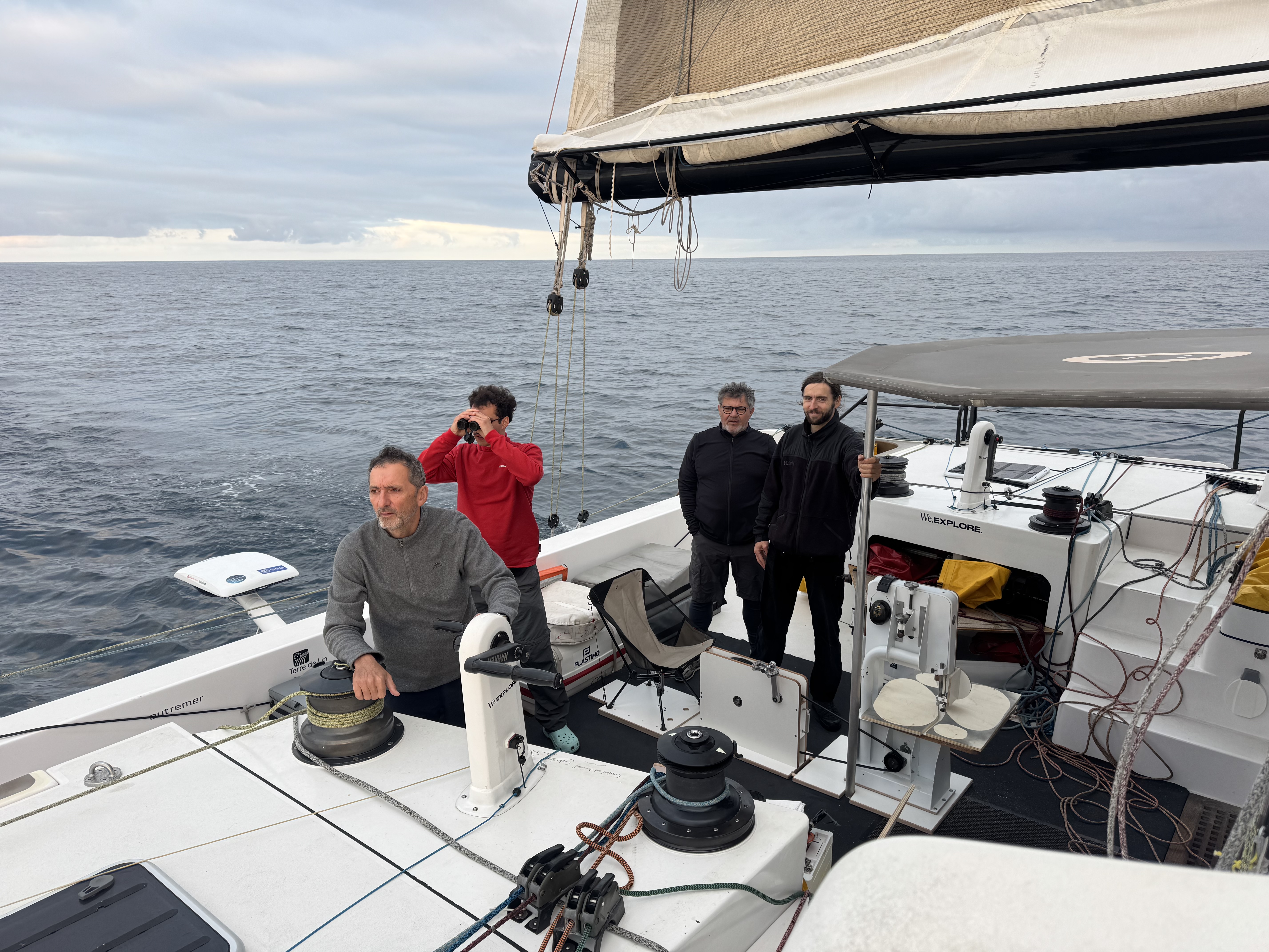 Agrandir l'image : Équipage à bord du catamaran We Explore en navigation au large, sous un ciel nuageux ; un marin à la barre, trois autres observant l’horizon, scène de vie à bord du voilier expérimental de Xavier Veilhan.
