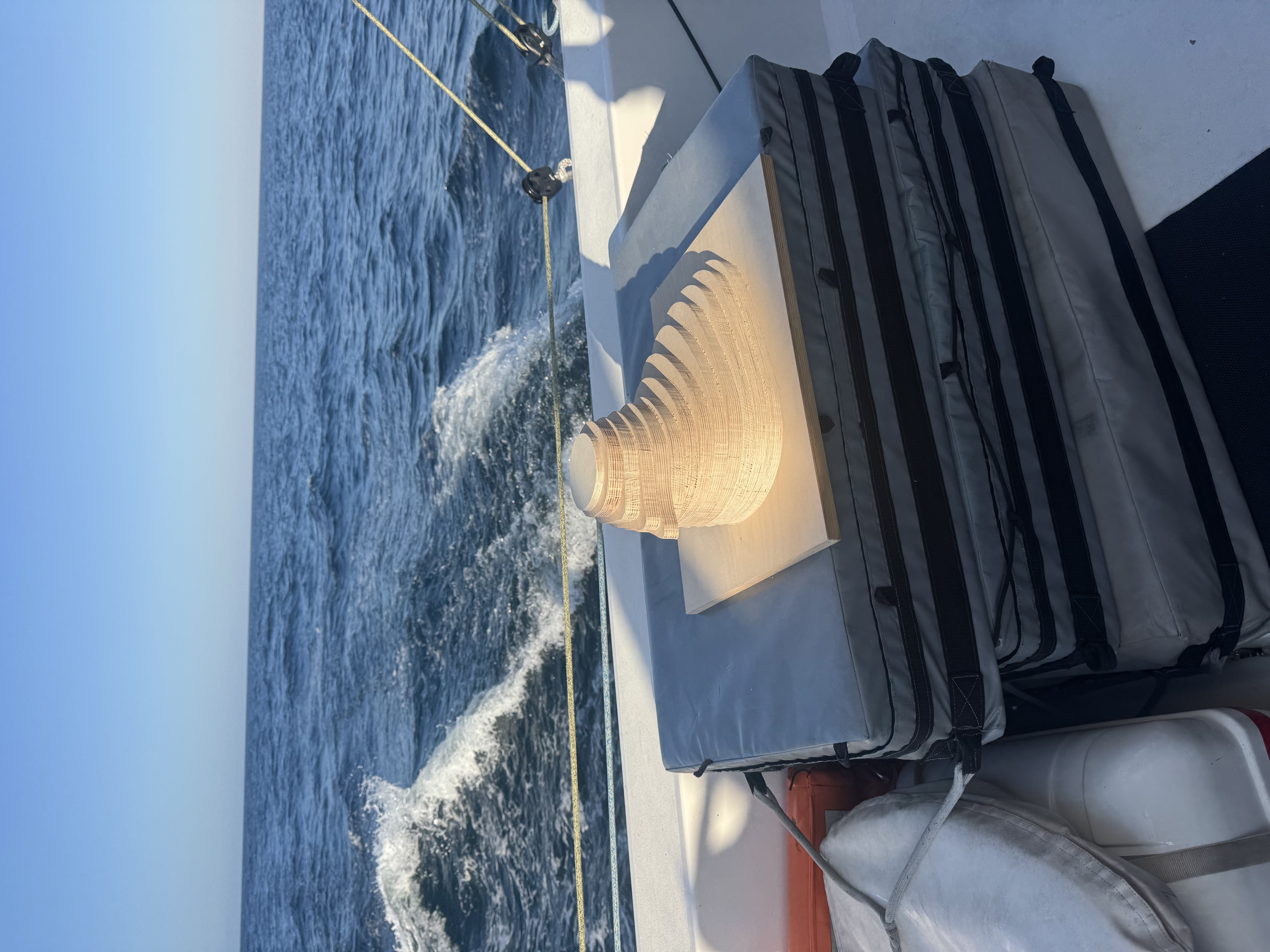 Agrandir l'image : Sculpture lumineuse en forme de coquillage posée sur des coussins sur le pont du voilier We Explore, en mer sous un ciel dégagé.