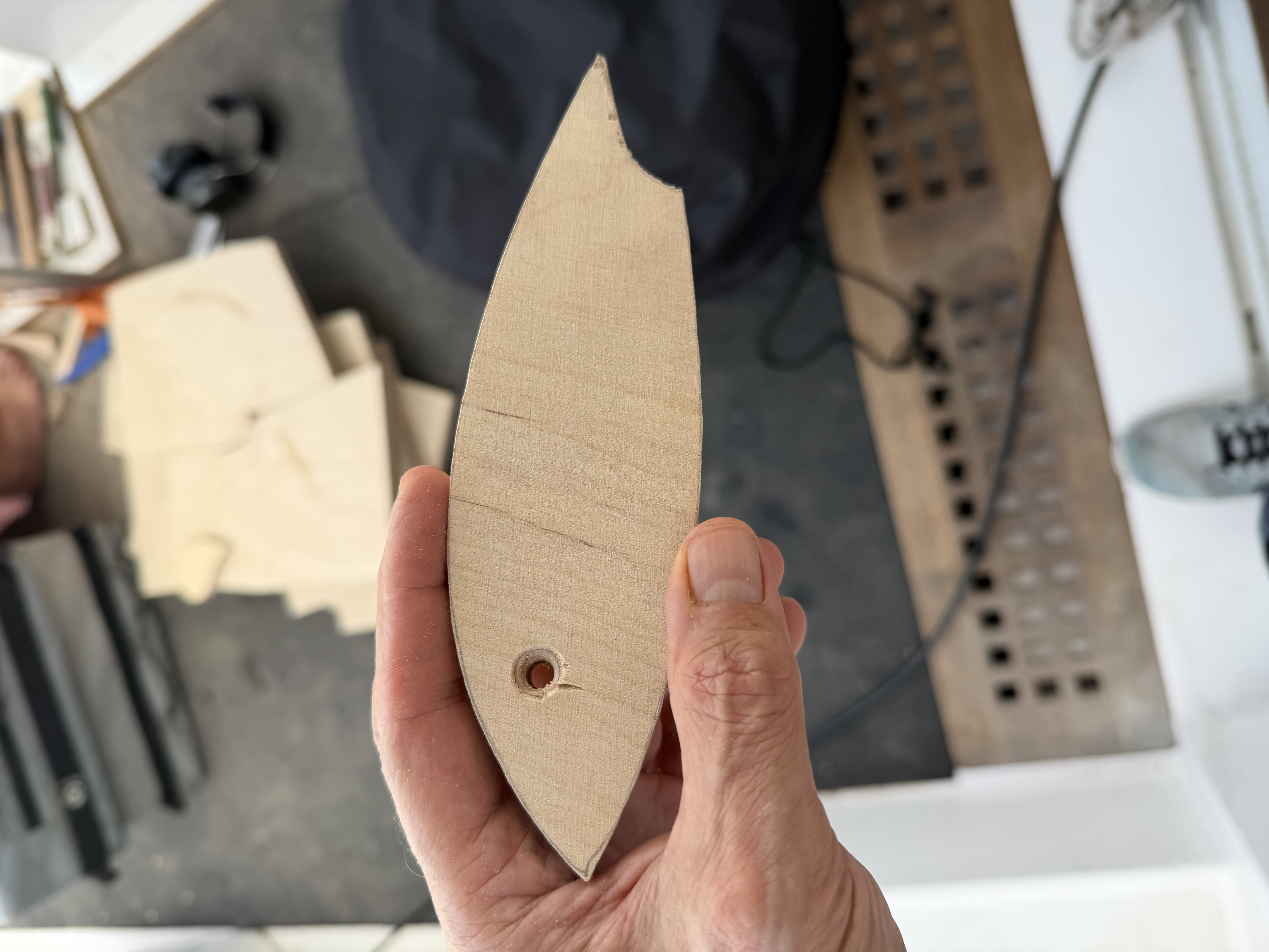 Agrandir l'image : Main tenant une petite sculpture en bois clair en forme de poisson, réalisée à bord du voilier We Explore.