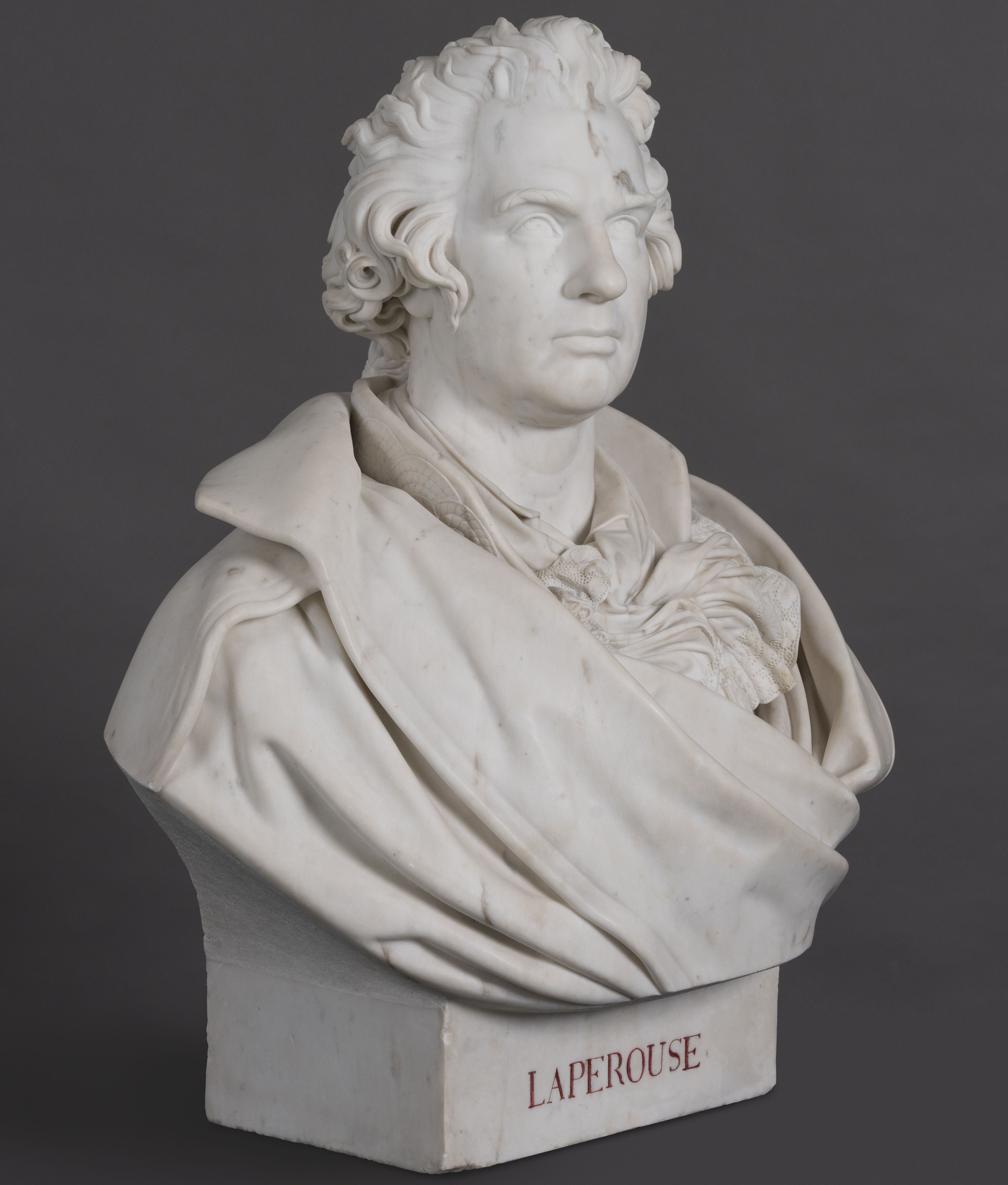Agrandir l'image : Buste sculpté de l’explorateur Lapérouse en marbre, représenté en habit drapé avec regard tourné sur fond neutre, œuvre de François Rude