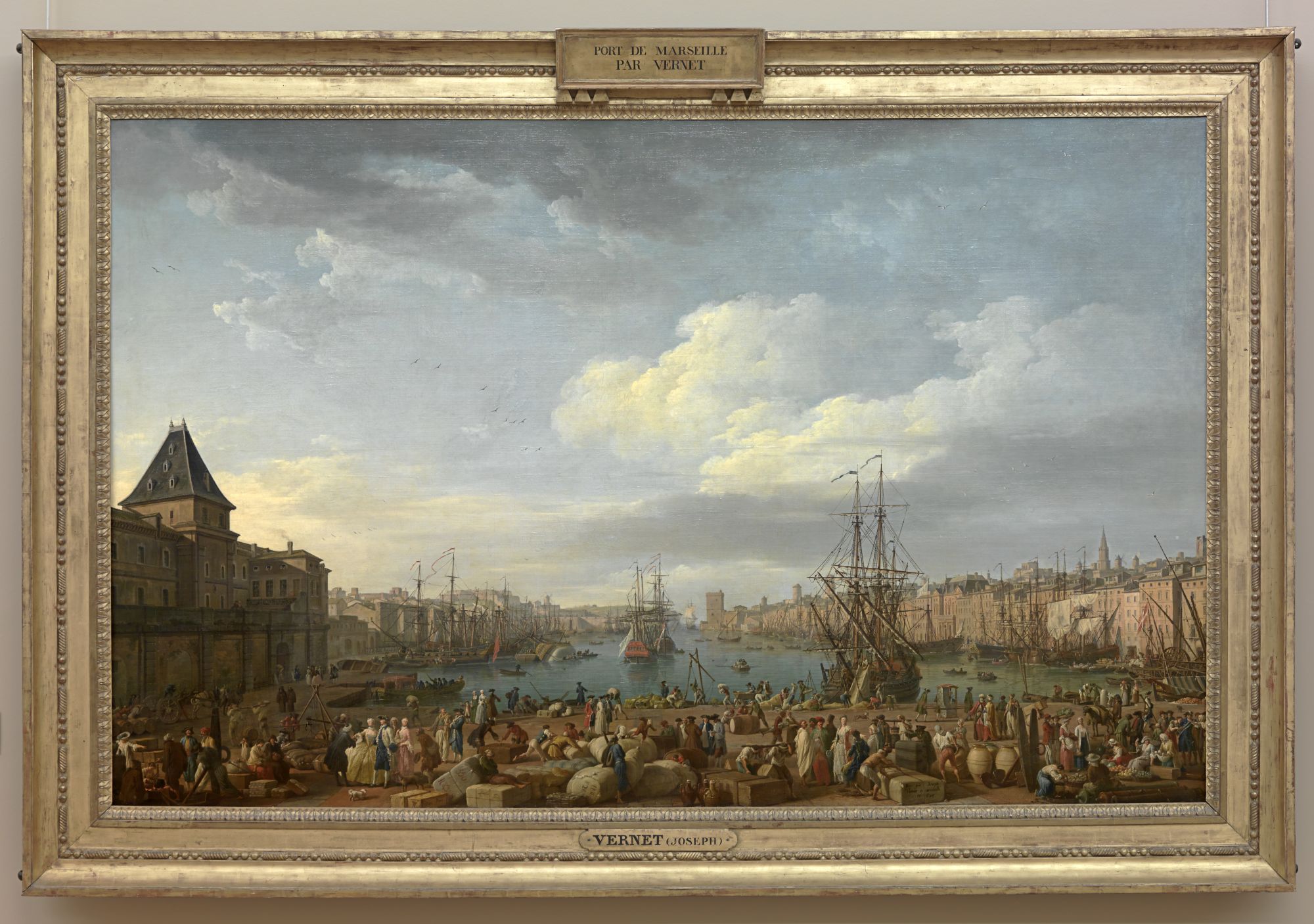 Agrandir l'image : Vue animée du port de Marseille au XVIIIe siècle, avec foule sur les quais, navires à voile et architecture urbaine sous un ciel lumineux, peinture de Joseph Vernet