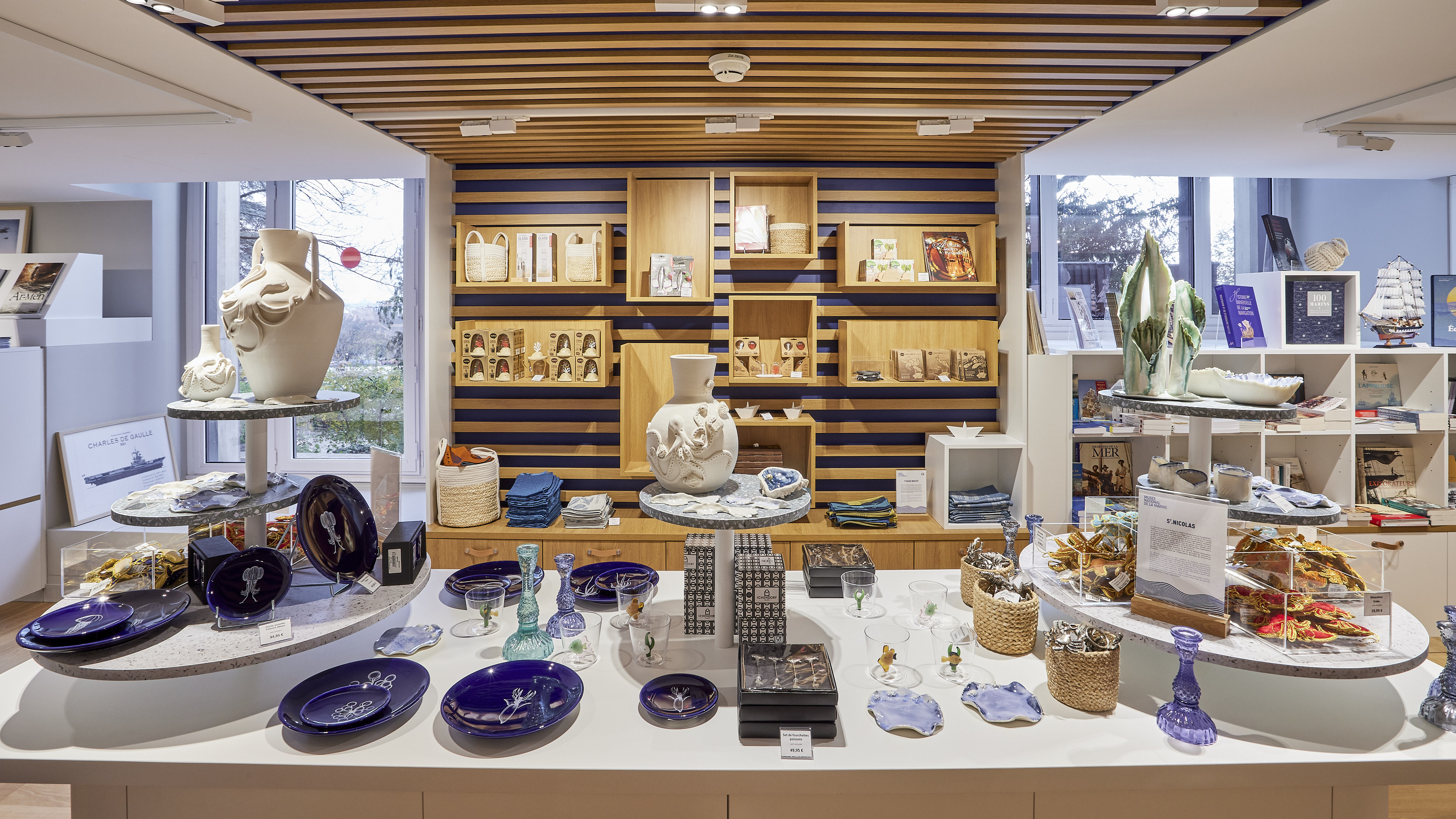 Agrandir l'image : Vue d’ensemble de la boutique du musée national de la Marine avec présentoirs centraux et objets inspirés du patrimoine maritime.