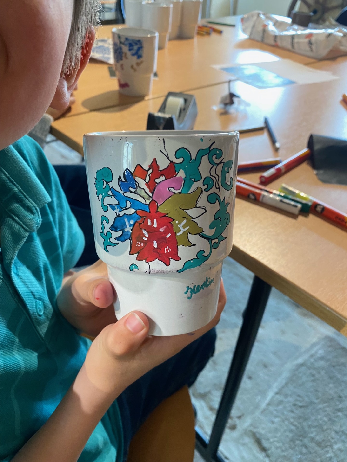 Agrandir l'image : Enfant participant à un atelier créatif au musée de la Marine de Port-Louis, décorant un objet avec des motifs colorés inspirés de la mer.
