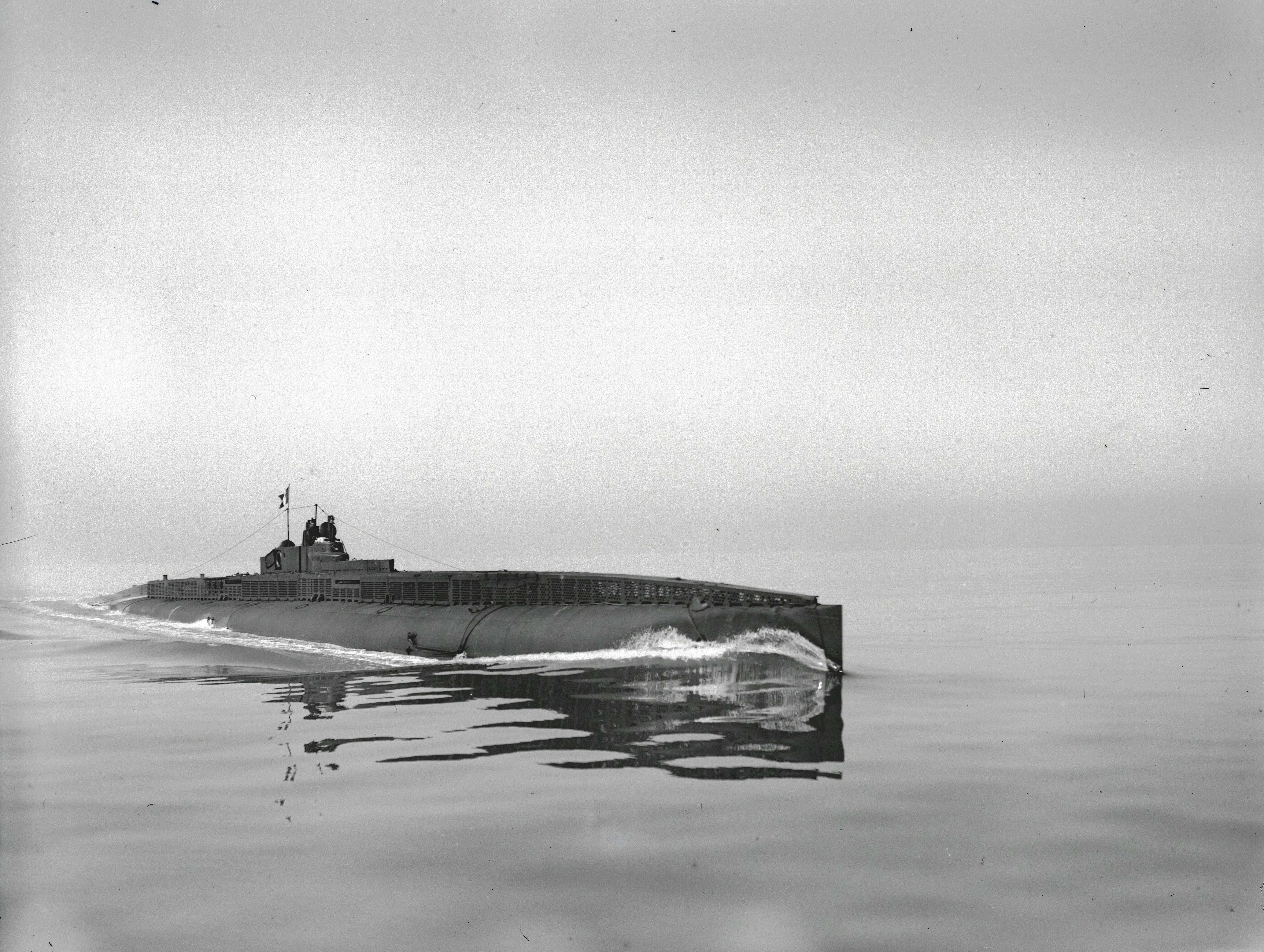 Agrandir l'image : Sous-marin en surface, photographie d’archive en noir et blanc illustrant les débuts des submersibles militaires présentés dans l’exposition de Rochefort