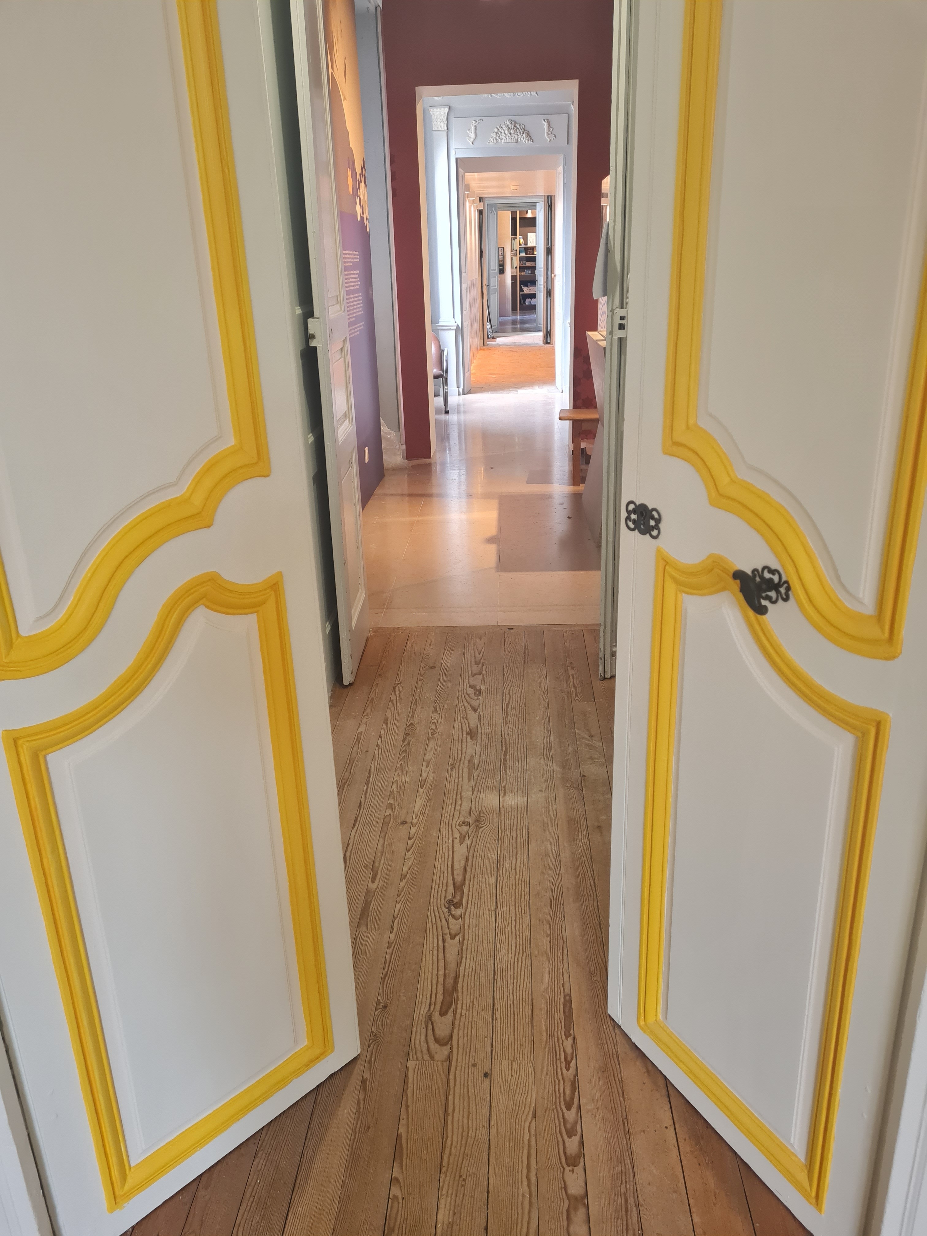 Agrandir l'image : Vue en perspective d’une enfilade de salles réaménagées avec portes blanches et moulures dorées au musée national de la Marine à Rochefort.