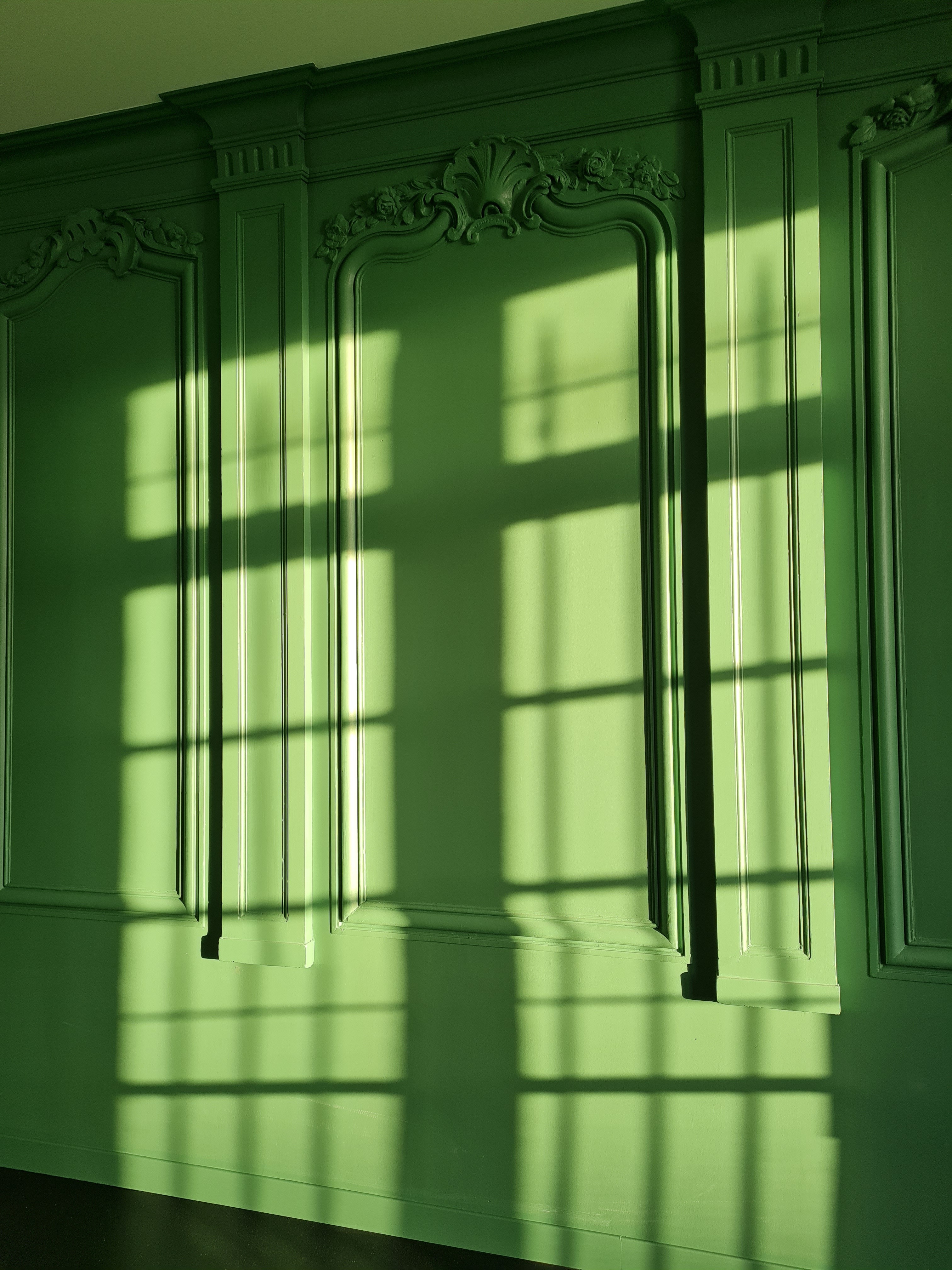 Agrandir l'image : Fenêtres laissant entrer la lumière sur des murs intérieurs repeints en vert dans le musée national de la Marine à Rochefort.